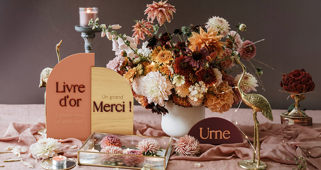 Apportez de la chaleur à votre célébration avec notre collection de décoration personnalisée Terracotta. Entre le bois réconfortant et les teintes ensoleillées, craquez pour une décoration à l'équilibre parfait pour un mariage à l'ambiance chaleureuse.